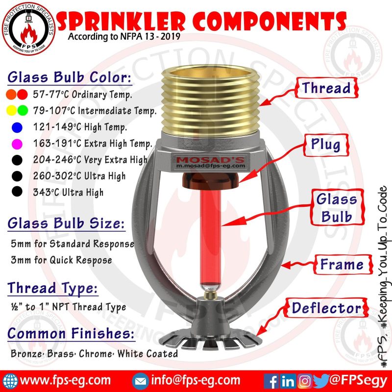 El Sprinkler contra incendios están compuestos por un orificio para la salida del agua, el mecanismo de disparo y un deflector que convierte el chorro de agua en dispersión y rocía el agua por la zona donde está el fuego.